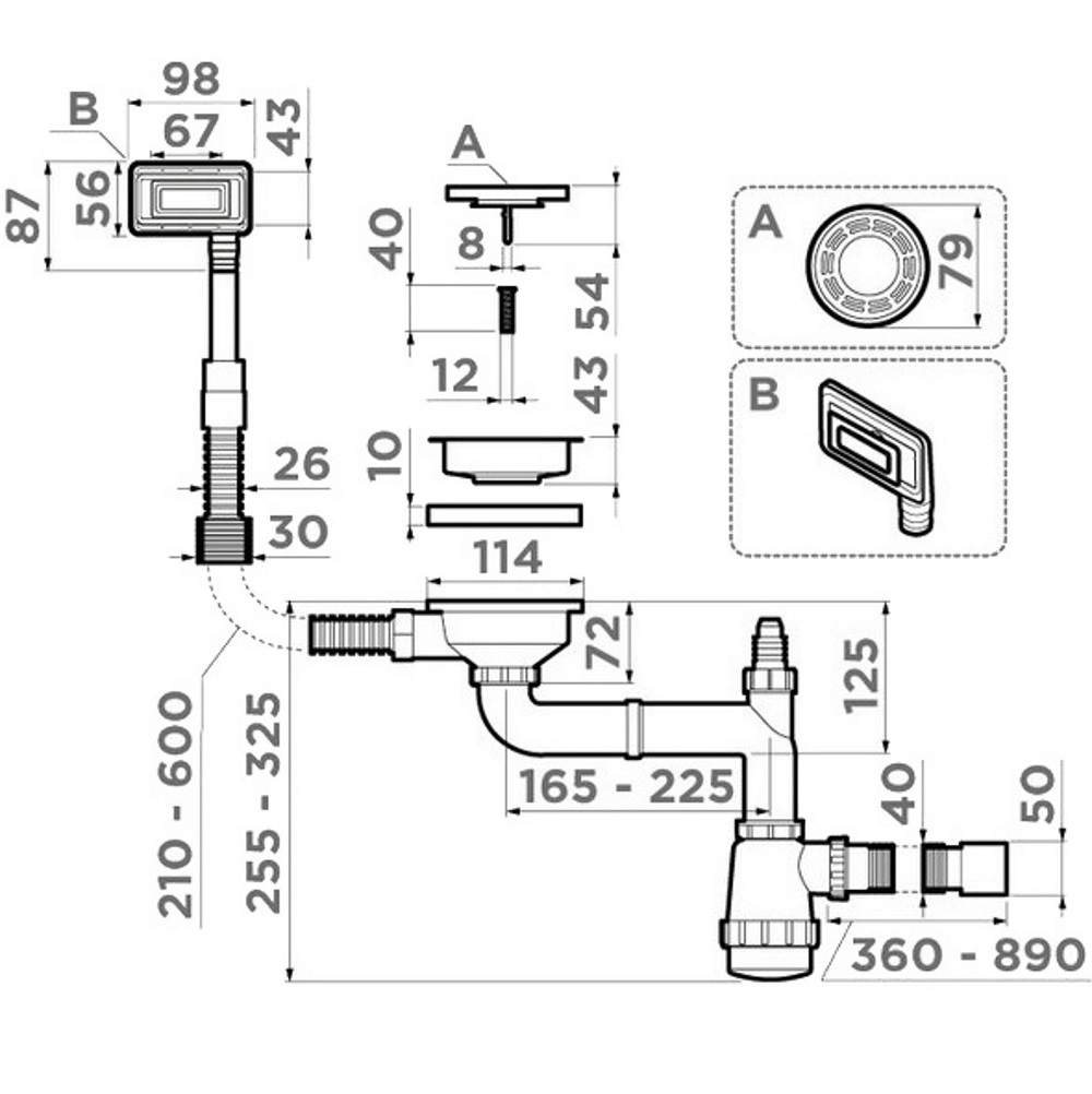 Арматура для одночашевых моек с универсальным прямоугольным переливом. Подходит для моек Kata c одной чашей, Tasogare 65 и 86, Yamakawa, Kitagawa, Sintesi.