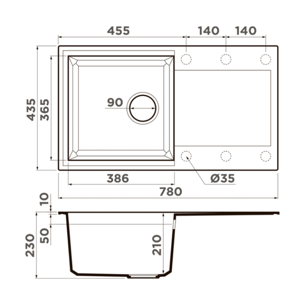Мойка кухонная Omoikiri из коллекции Sakaime 78-DC имеет размеры 780х435 мм., изготовлена из искусственного гранита. Форма — прямоугольная, одна чаша без отверстия для смесителя. Сифон в комплекте. Ширина чаши 38,6. Врезной монтаж. Имеется крыло.