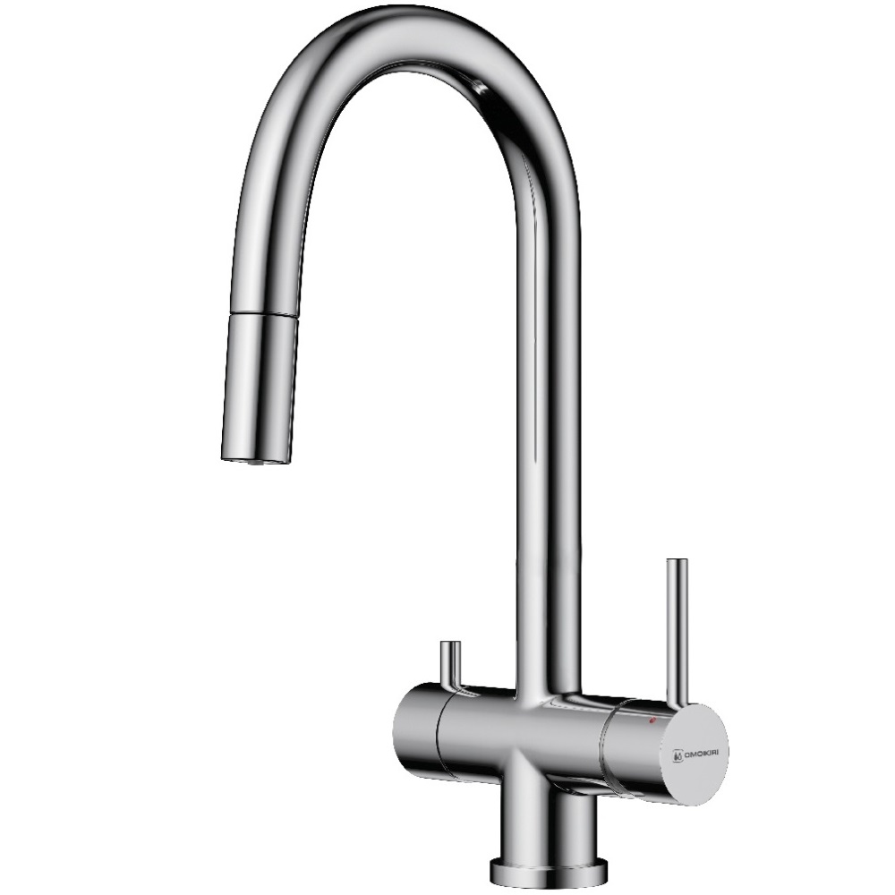Смеситель для кухни Omoikiri Akita-S с подключением фильтра и выдвижной излив оснащен рычажным управлением для регулировки температуры и напора воды. Горизонтальный монтаж на 1 отверстие. Поворотный излив 215 мм.