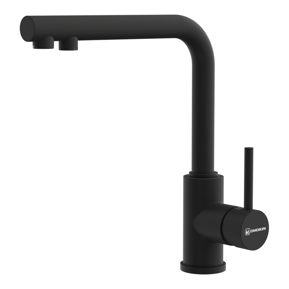 Смеситель для кухни Omoikiri Nakagawa 2 Plus с подключением фильтра оснащен рычажным управлением для регулировки температуры и напора воды. Горизонтальный монтаж на 1 отверстие. Поворотный излив 210 мм.